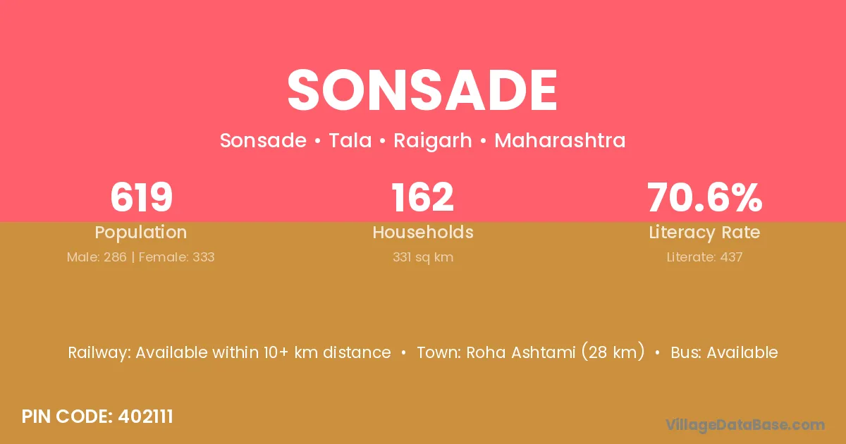 Roha Ashtami (28 km) is the nearest town to Sonsade village for major economic activities and is located approximately 28 km away.