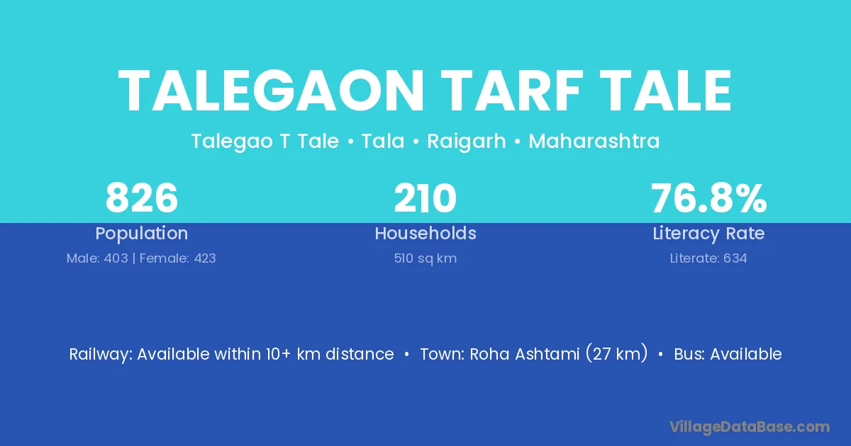 Roha Ashtami (27 km) is the nearest town to Talegaon Tarf Tale village for major economic activities and is located approximately 27 km away.