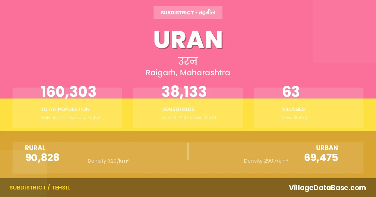 According to the 2011 census The total area of Uran Tehsil is 308 km², with a population of 160303 people. The population density is 520 inhabitants per square kilometre, and there are approximately 38133 houses in the sub district.