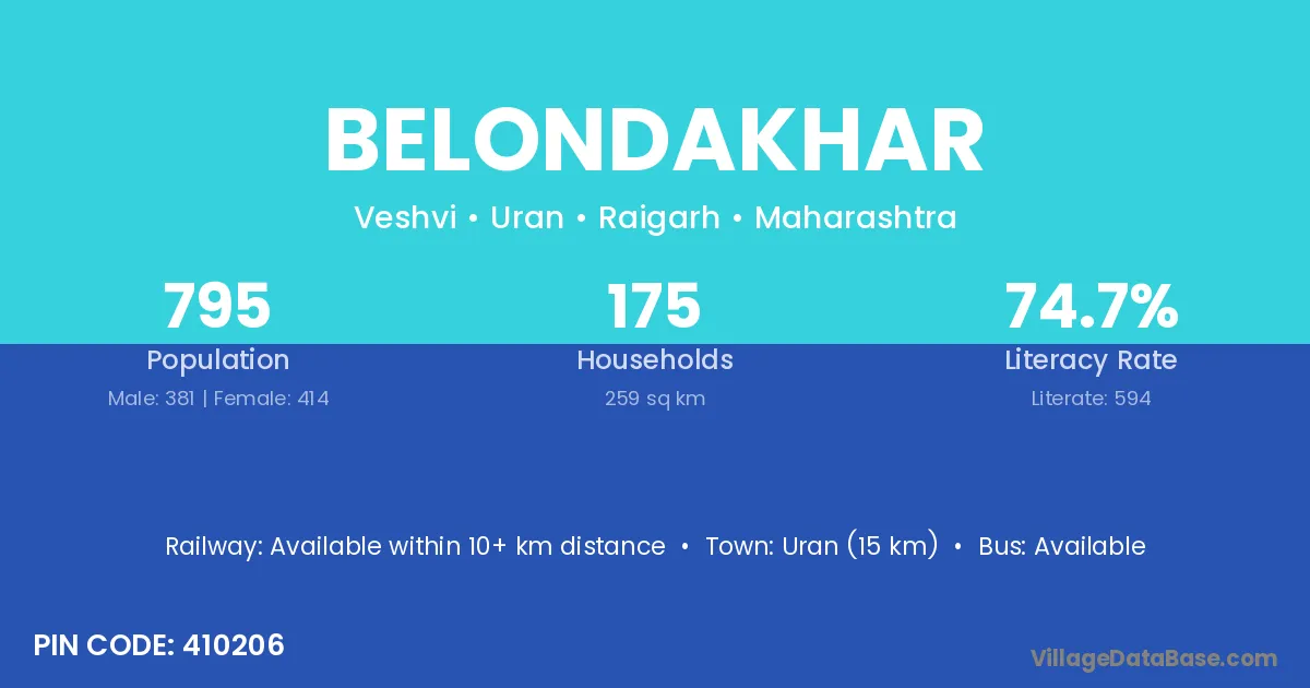 Uran (15 km) is the nearest town to Belondakhar village for major economic activities and is located approximately 15 km away.