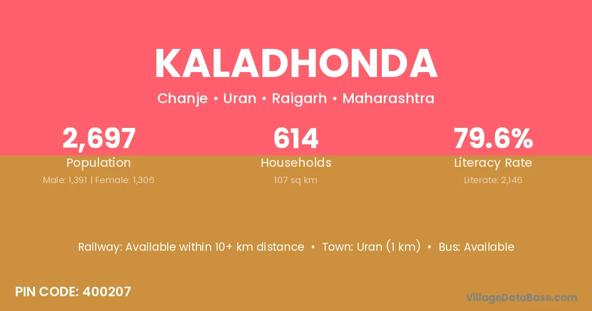 Uran (1 km) is the nearest town to Kaladhonda village for major economic activities and is located approximately 1 km away.