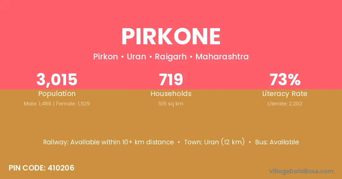 Uran (12 km) is the nearest town to Pirkone village for major economic activities and is located approximately 12 km away.