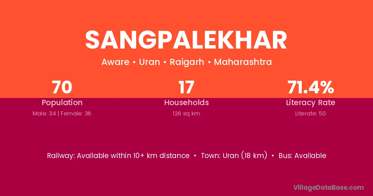 Uran (18 km) is the nearest town to Sangpalekhar village for major economic activities and is located approximately 18 km away.