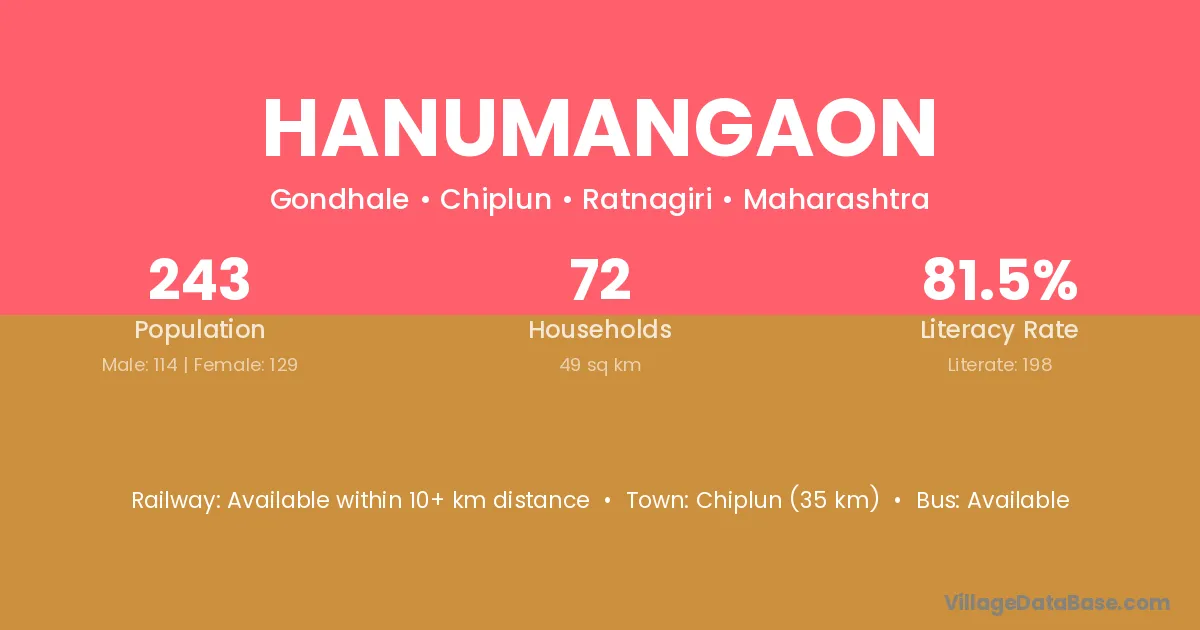 Chiplun (35 km) is the nearest town to Hanumangaon village for major economic activities and is located approximately 35 km away.
