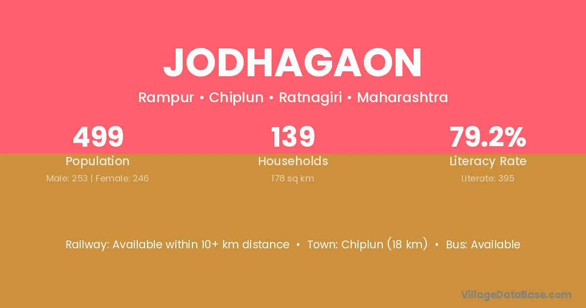 Chiplun (18 km) is the nearest town to Jodhagaon village for major economic activities and is located approximately 18 km away.