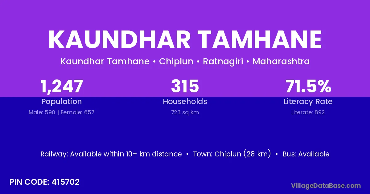 Chiplun (28 km) is the nearest town to Kaundhar Tamhane village for major economic activities and is located approximately 28 km away.