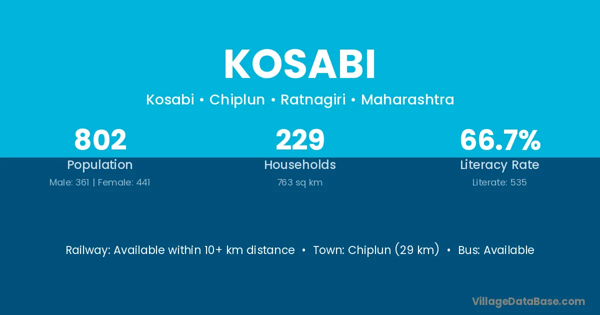 Chiplun (29 km) is the nearest town to Kosabi village for major economic activities and is located approximately 29 km away.