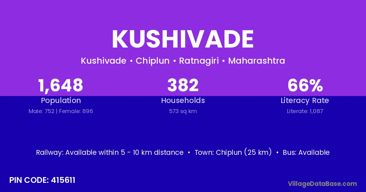 Chiplun (25 km) is the nearest town to Kushivade village for major economic activities and is located approximately 25 km away.