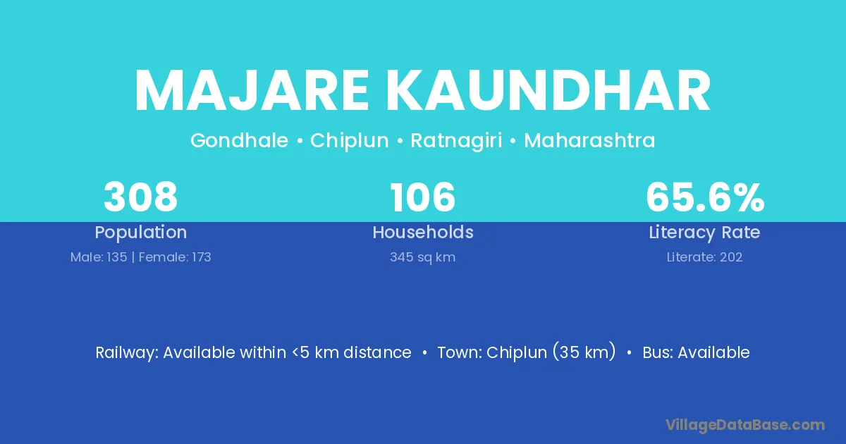 Chiplun (35 km) is the nearest town to Majare Kaundhar village for major economic activities and is located approximately 35 km away.
