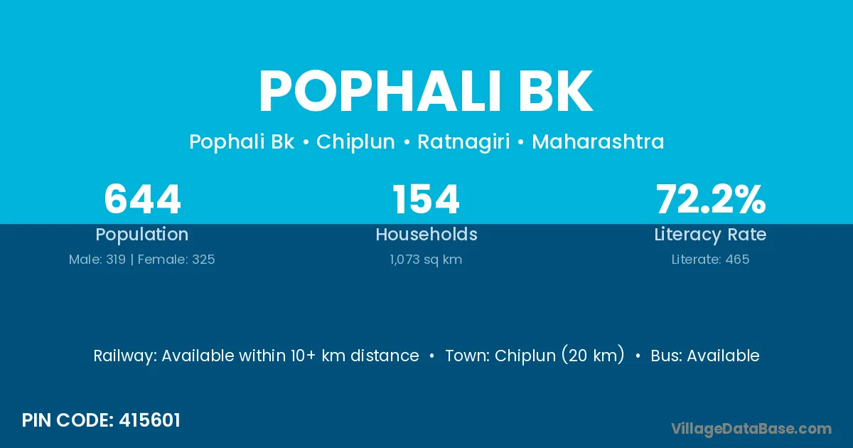 Chiplun (20 km) is the nearest town to Pophali Bk village for major economic activities and is located approximately 20 km away.