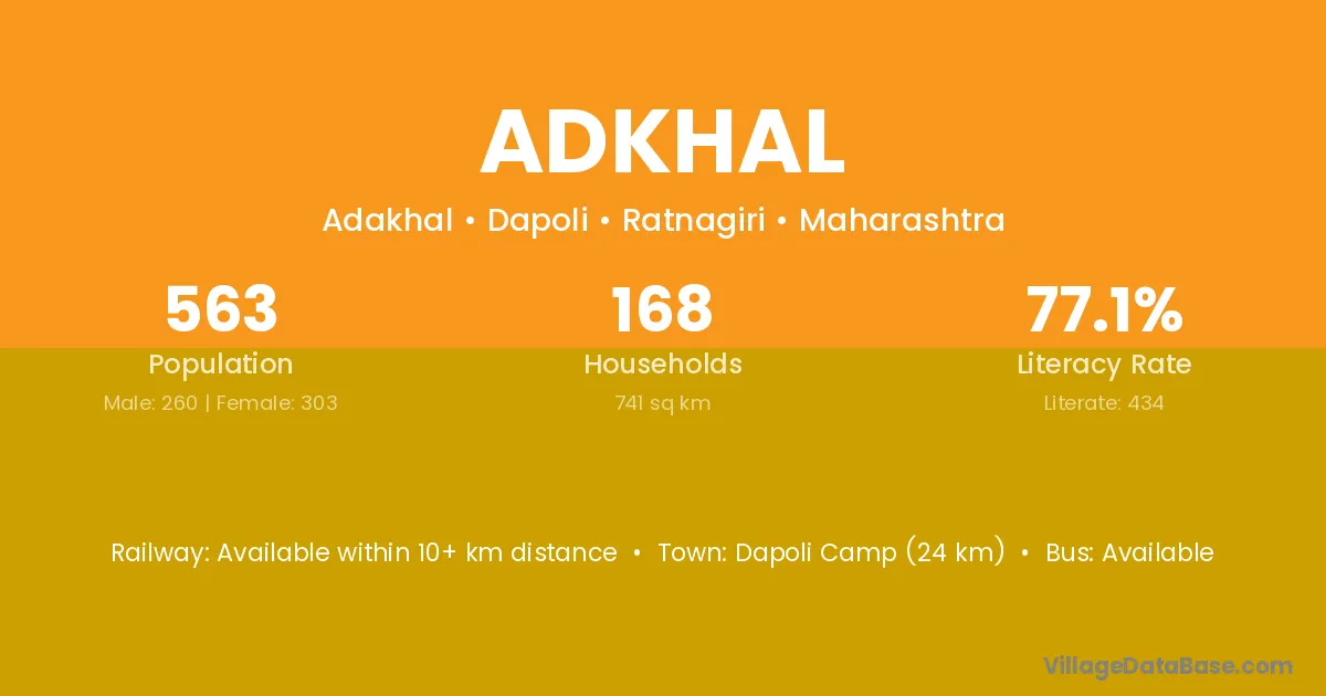Dapoli Camp (24 km) is the nearest town to Adkhal village for major economic activities and is located approximately 24 km away.
