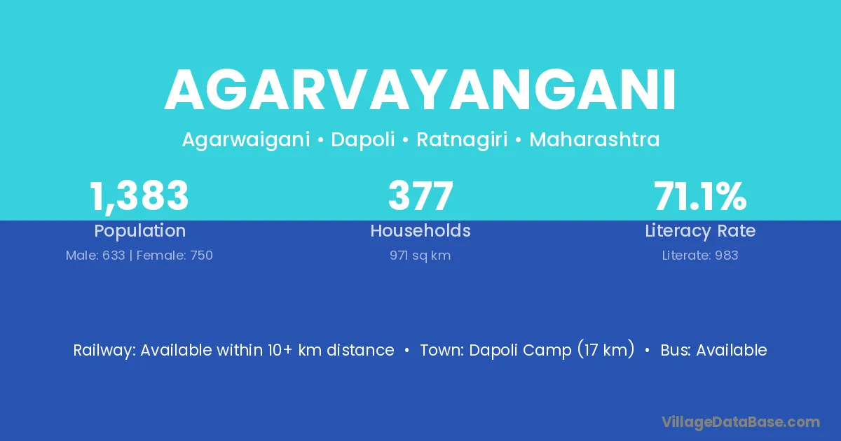 Dapoli Camp (17 km) is the nearest town to Agarvayangani village for major economic activities and is located approximately 17 km away.