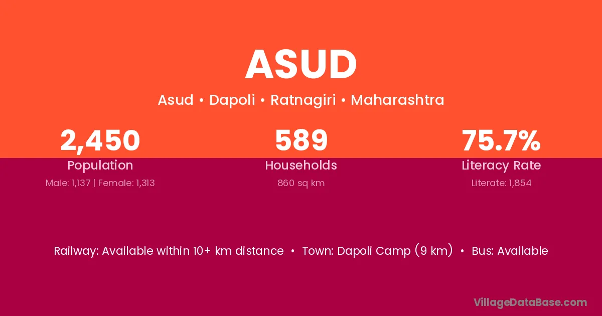 Dapoli Camp (9 km) is the nearest town to Asud village for major economic activities and is located approximately 9 km away.