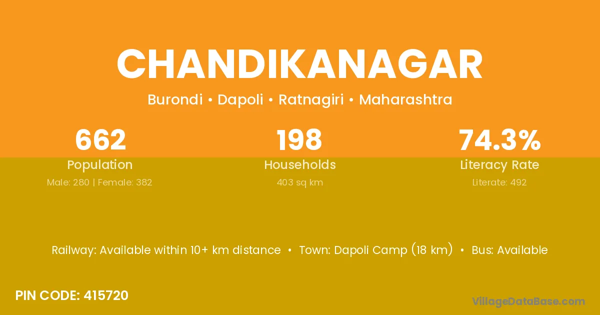 Dapoli Camp (18 km) is the nearest town to Chandikanagar village for major economic activities and is located approximately 18 km away.