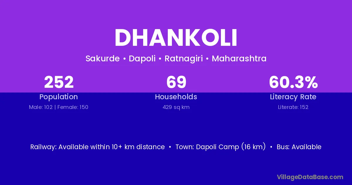 Dapoli Camp (16 km) is the nearest town to Dhankoli village for major economic activities and is located approximately 16 km away.