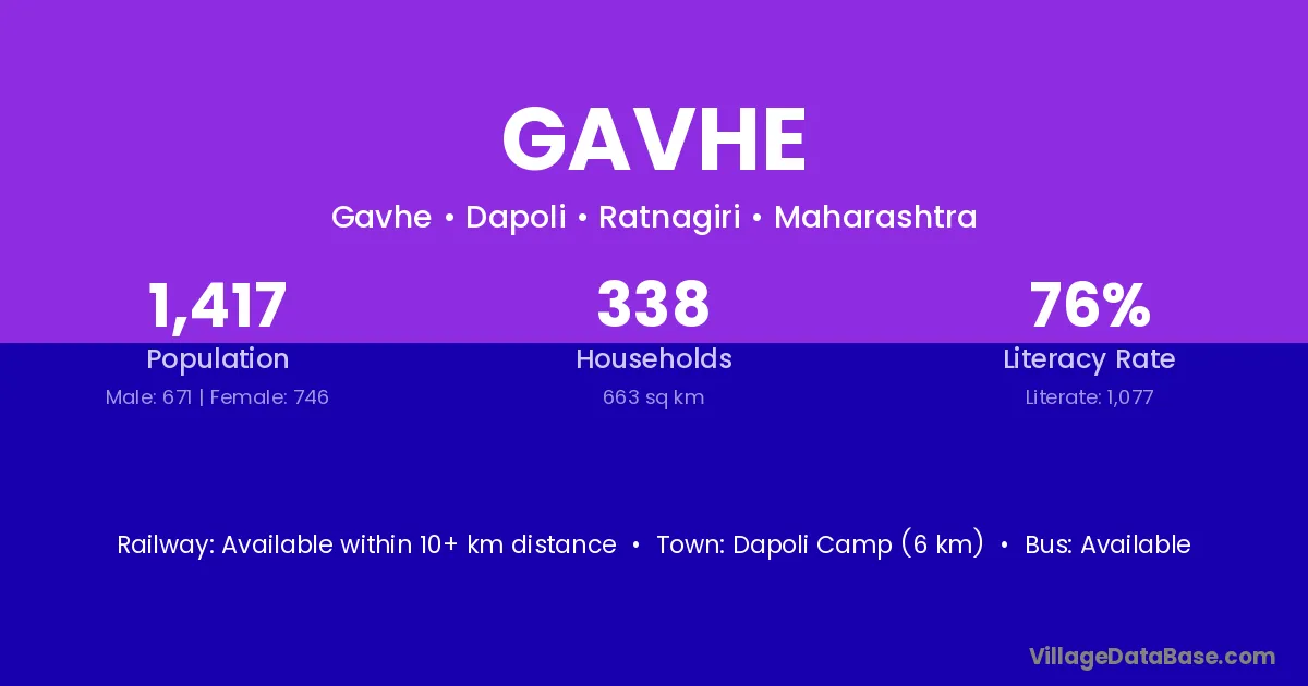Dapoli Camp (6 km) is the nearest town to Gavhe village for major economic activities and is located approximately 6 km away.