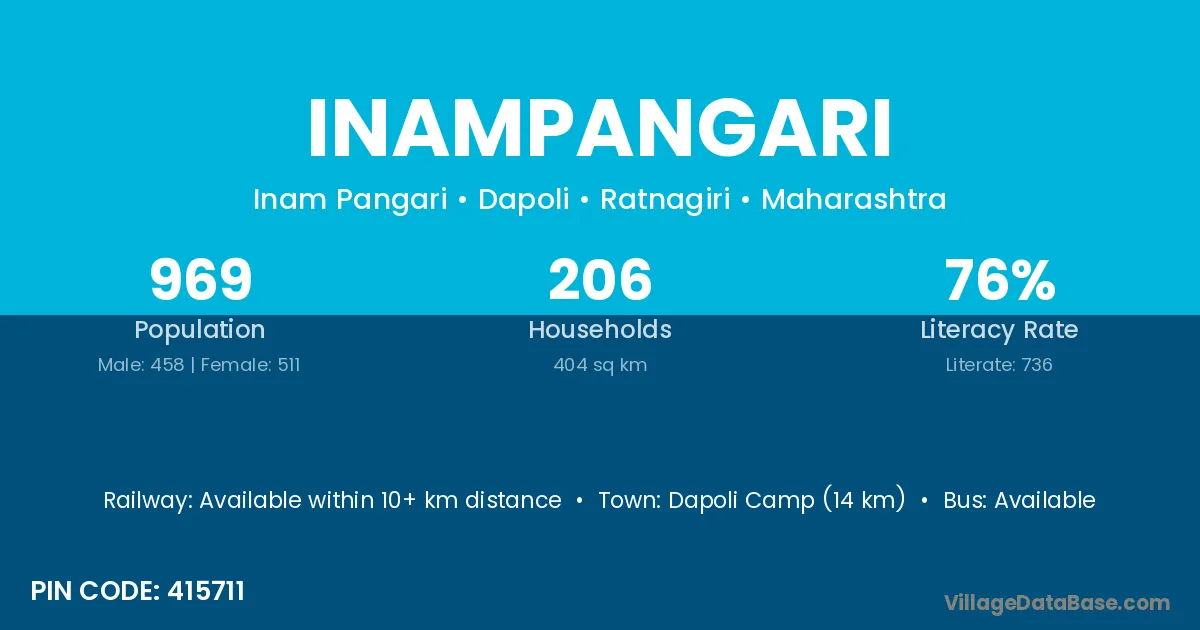 Dapoli Camp (14 km) is the nearest town to Inampangari village for major economic activities and is located approximately 14 km away.