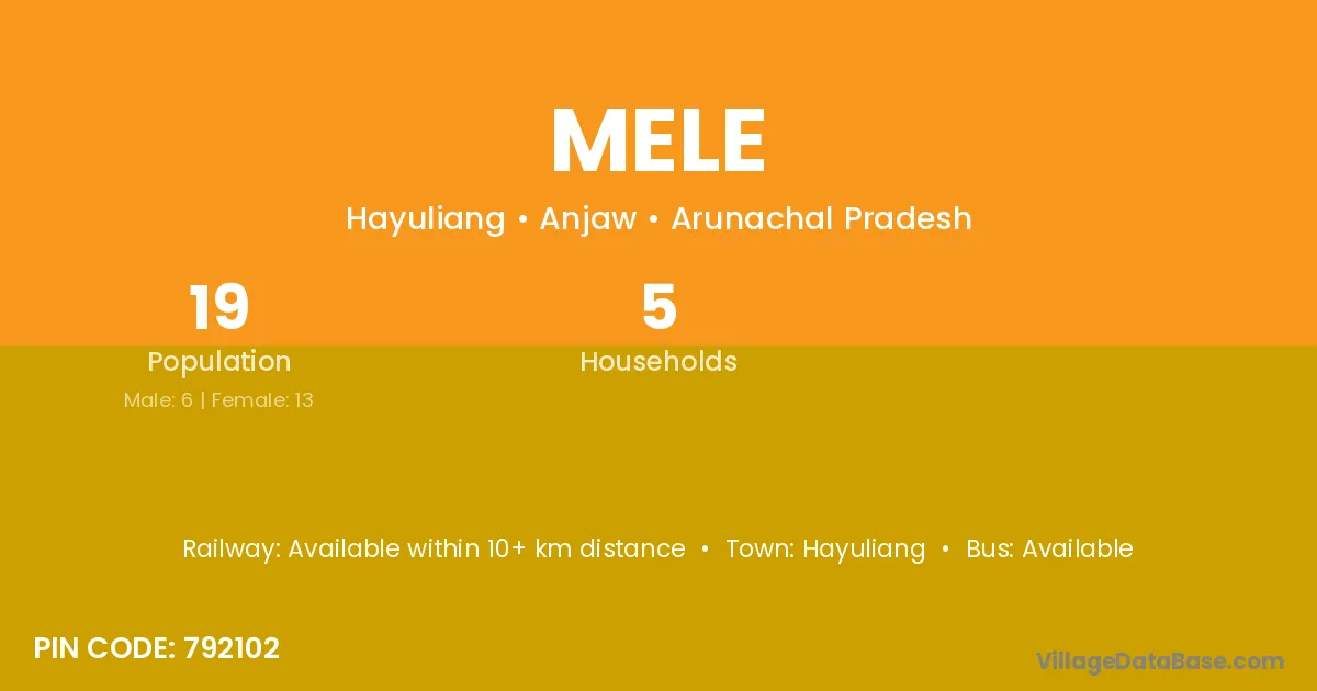 Dapoli Camp (19 km) is the nearest town to Mele village for major economic activities and is located approximately 19 km away.