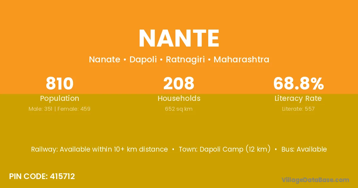 Dapoli Camp (12 km) is the nearest town to Nante village for major economic activities and is located approximately 12 km away.