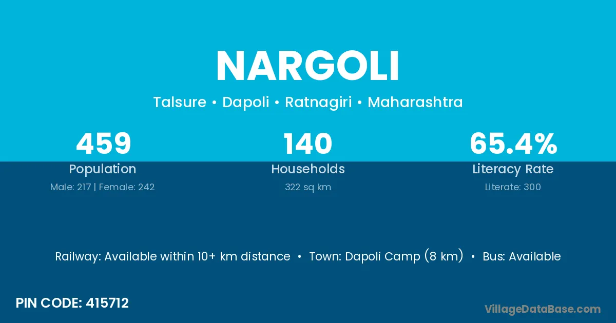 Dapoli Camp (8 km) is the nearest town to Nargoli village for major economic activities and is located approximately 8 km away.