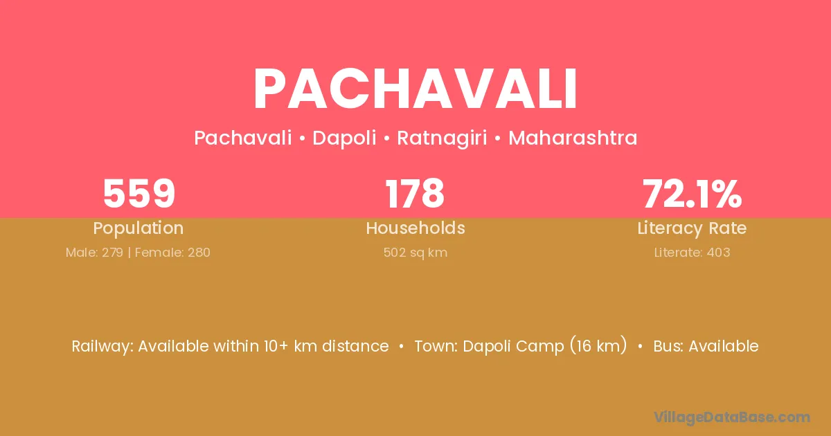 Dapoli Camp (16 km) is the nearest town to Pachavali village for major economic activities and is located approximately 16 km away.