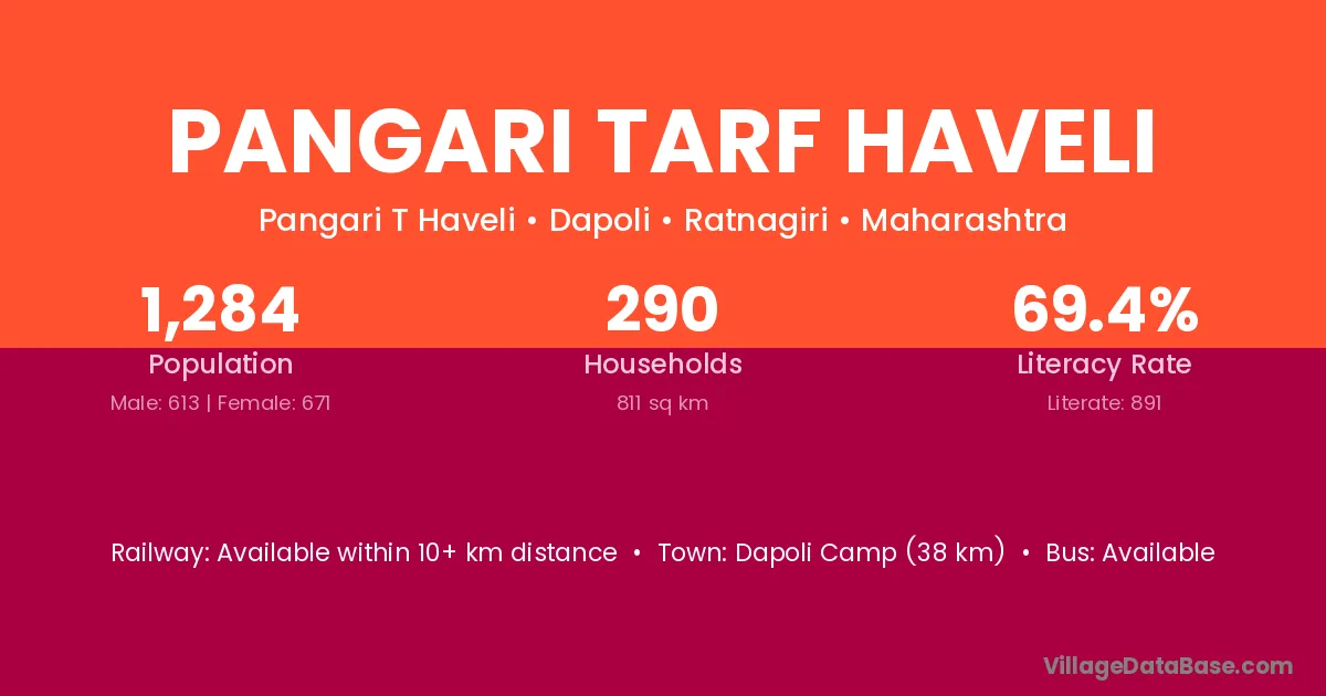 Dapoli Camp (38 km) is the nearest town to Pangari Tarf Haveli village for major economic activities and is located approximately 38 km away.