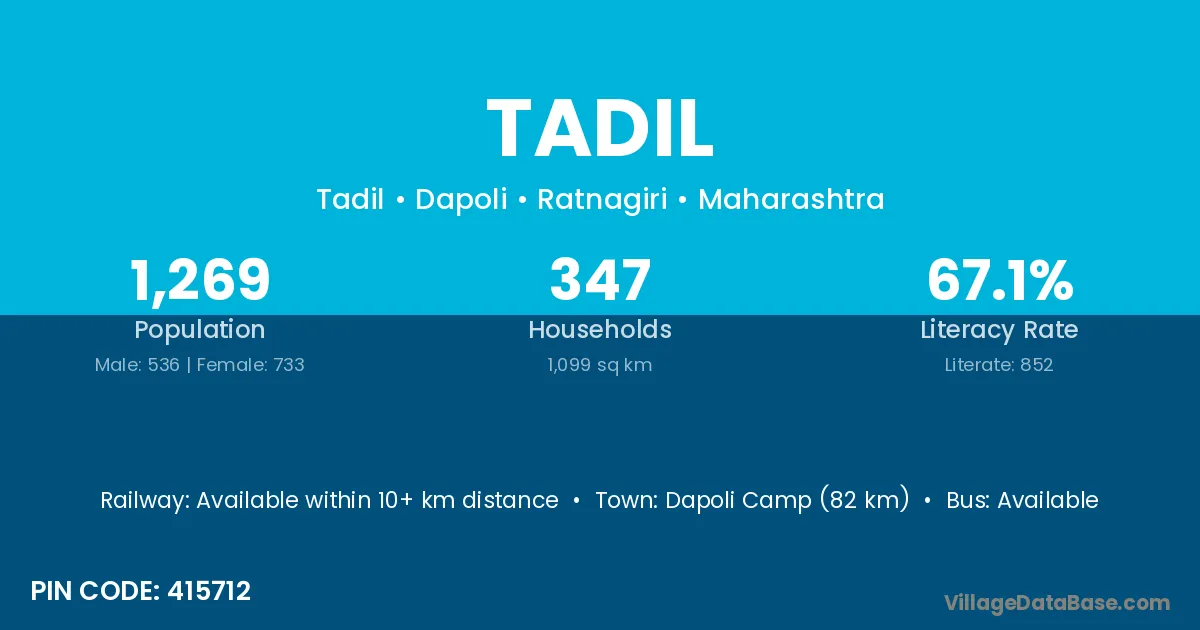 Dapoli Camp (82 km) is the nearest town to Tadil village for major economic activities and is located approximately 82 km away.