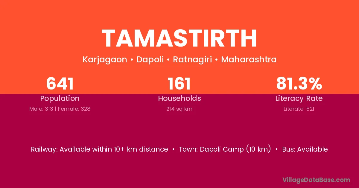 Dapoli Camp (10 km) is the nearest town to Tamastirth village for major economic activities and is located approximately 10 km away.