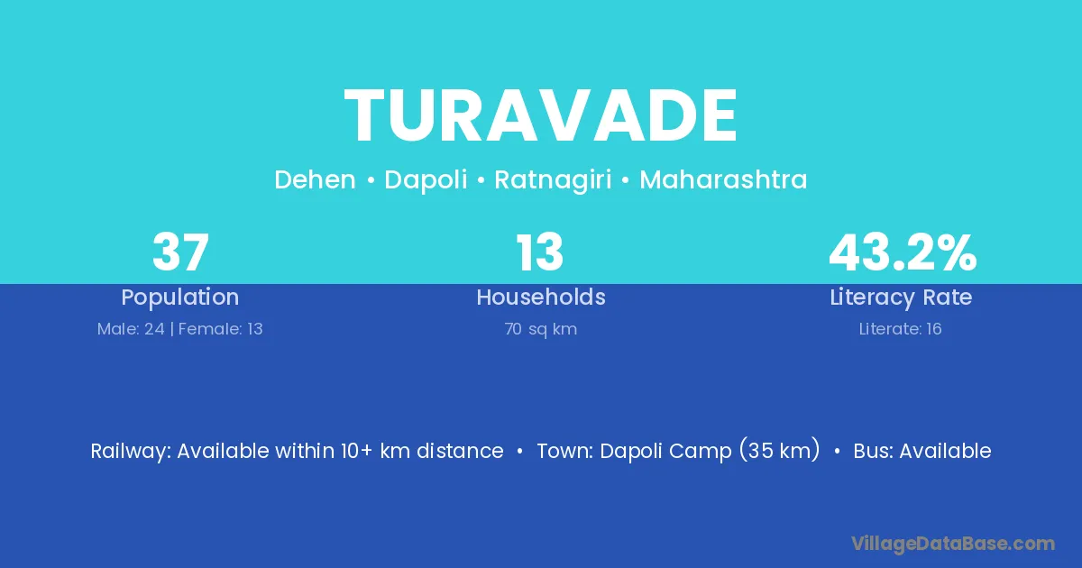 Dapoli Camp (35 km) is the nearest town to Turavade village for major economic activities and is located approximately 35 km away.