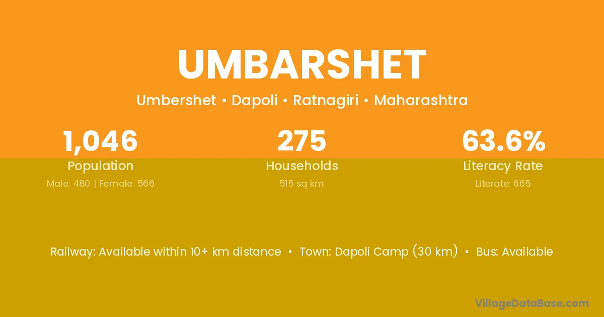 Dapoli Camp (30 km) is the nearest town to Umbarshet village for major economic activities and is located approximately 30 km away.