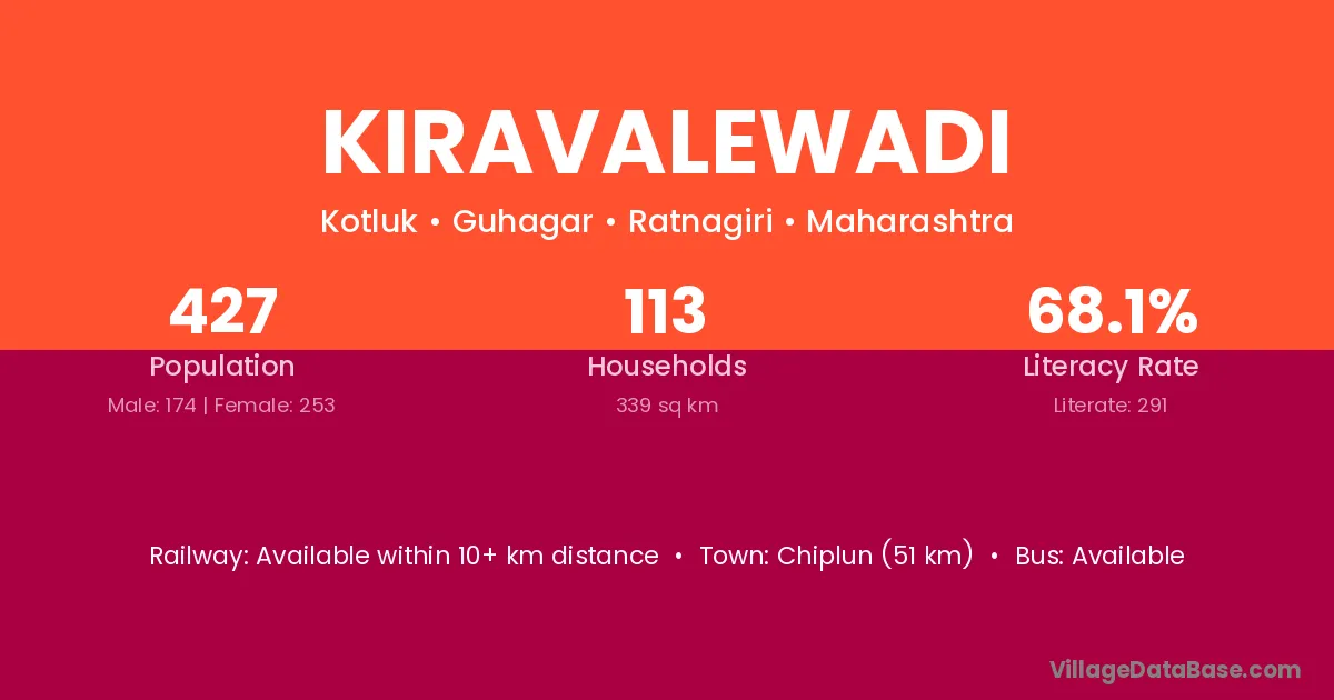 Kiravalewadi village has a total population of 427 people, of which 174 are males and 253 are females.
