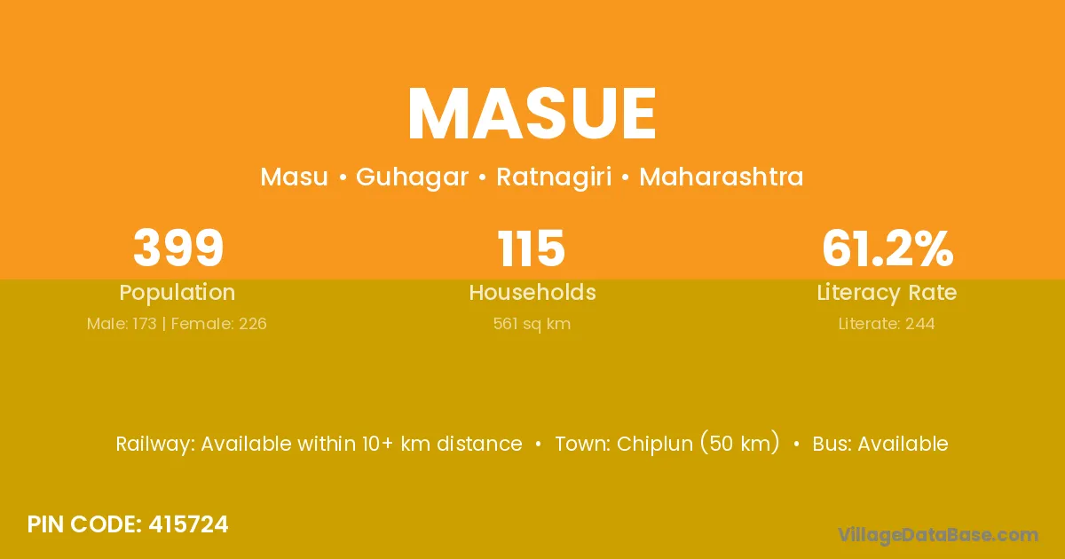 Chiplun (50 km) is the nearest town to Masue village for major economic activities and is located approximately 50 km away.