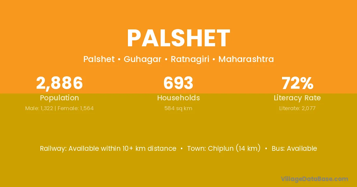 Chiplun (14 km) is the nearest town to Palshet village for major economic activities and is located approximately 14 km away.