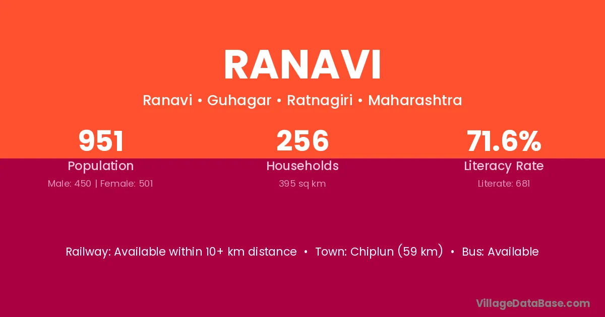 Chiplun (59 km) is the nearest town to Ranavi village for major economic activities and is located approximately 59 km away.