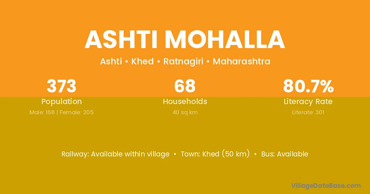 Khed (50 km) is the nearest town to Ashti Mohalla village for major economic activities and is located approximately 50 km away.