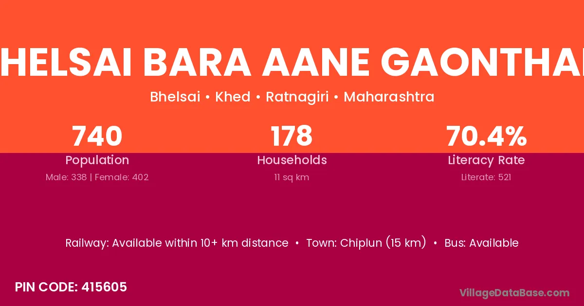 Chiplun (15 km) is the nearest town to Bhelsai Bara Aane Gaonthan village for major economic activities and is located approximately 15 km away.