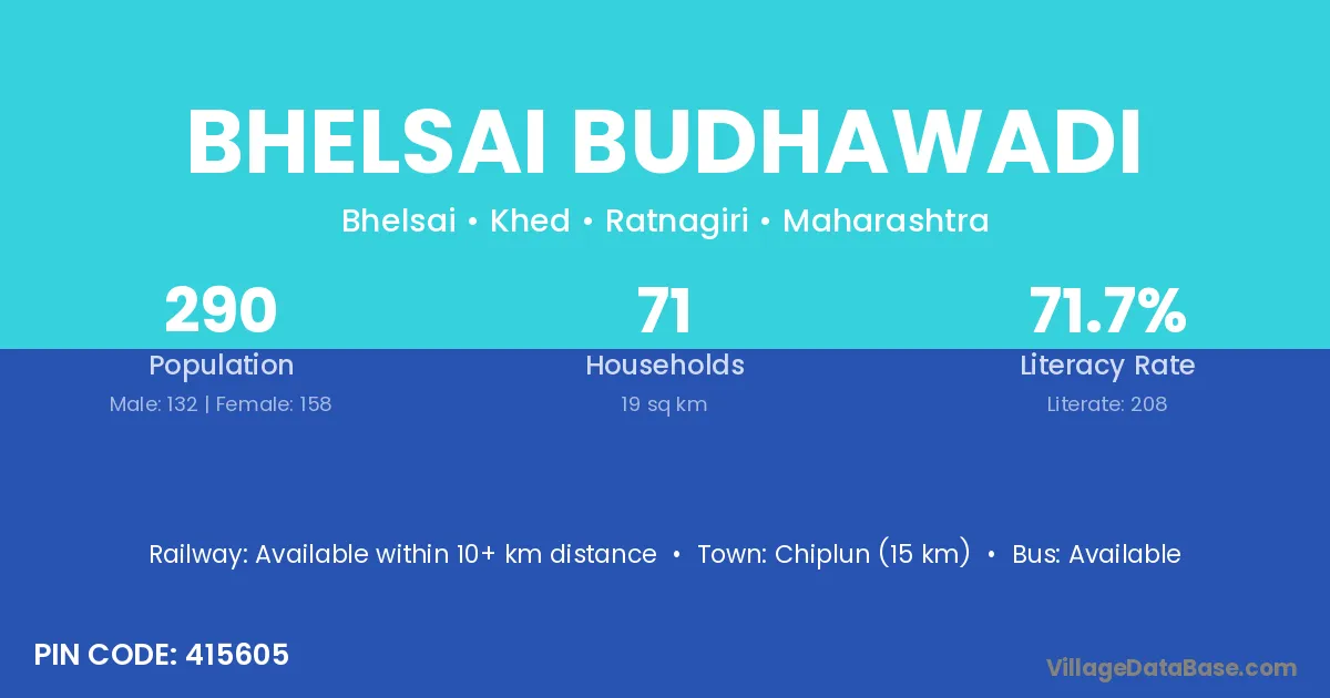 Chiplun (15 km) is the nearest town to Bhelsai Budhawadi village for major economic activities and is located approximately 15 km away.