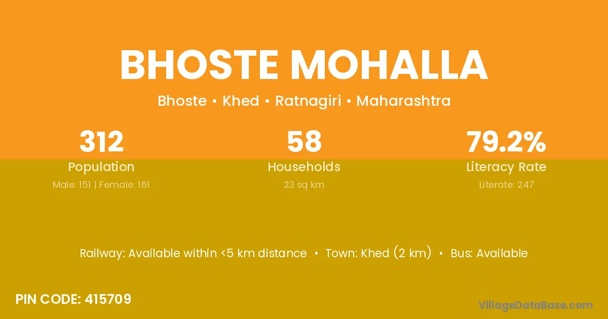 Khed (2 km) is the nearest town to Bhoste Mohalla village for major economic activities and is located approximately 2 km away.