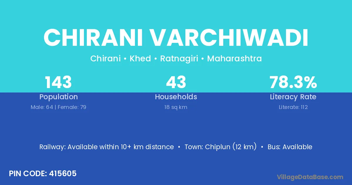 Chirani Varchiwadi village has a total population of 143 people, of which 64 are males and 79 are females.