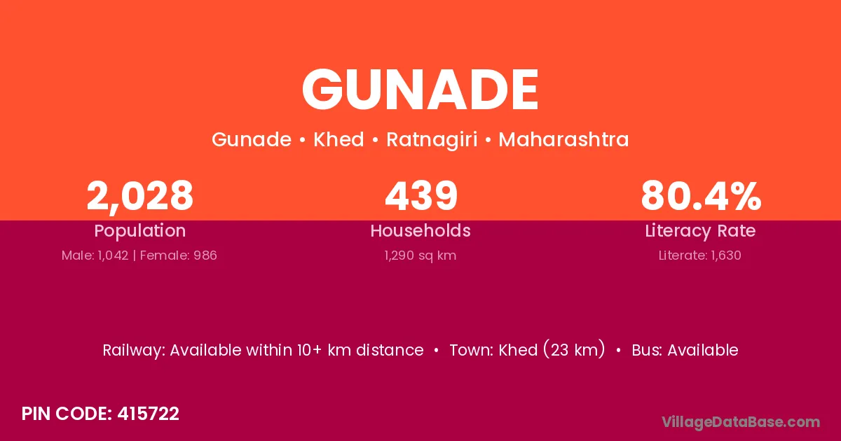 Khed (23 km) is the nearest town to Gunade village for major economic activities and is located approximately 23 km away.