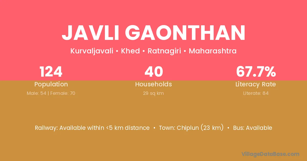 Chiplun (23 km) is the nearest town to Javli Gaonthan village for major economic activities and is located approximately 23 km away.