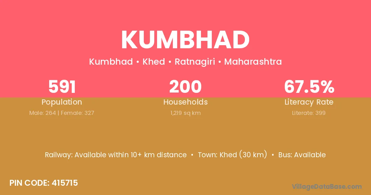 Khed (30 km) is the nearest town to Kumbhad village for major economic activities and is located approximately 30 km away.