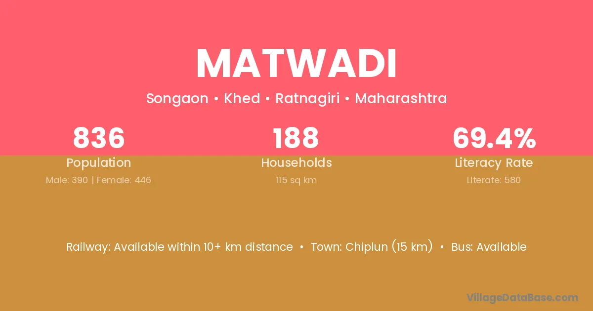 Chiplun (15 km) is the nearest town to Matwadi village for major economic activities and is located approximately 15 km away.