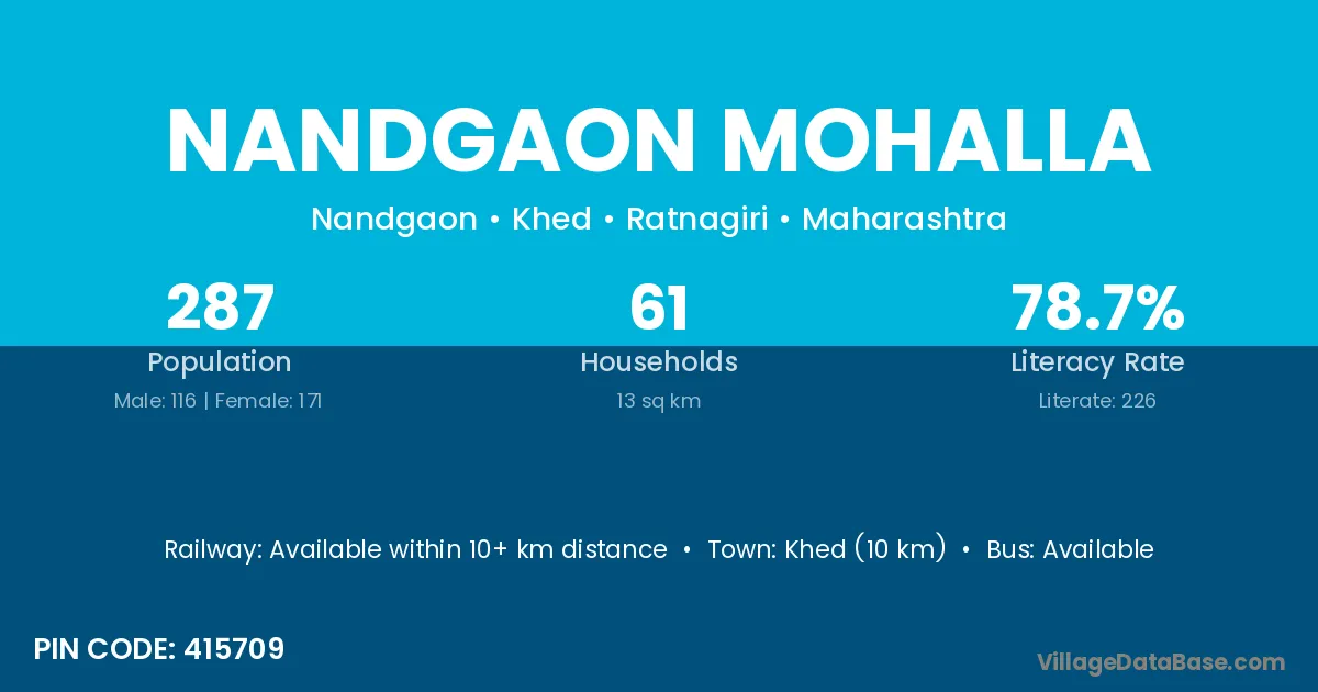 Khed (10 km) is the nearest town to Nandgaon Mohalla village for major economic activities and is located approximately 10 km away.