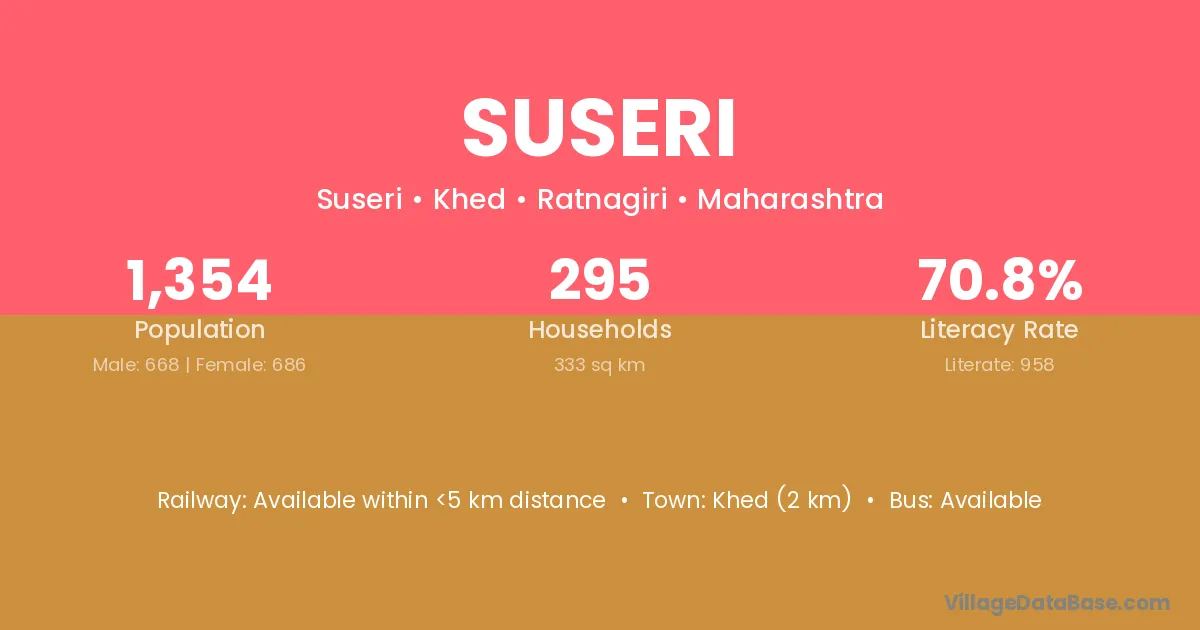 Khed (2 km) is the nearest town to Suseri village for major economic activities and is located approximately 2 km away.