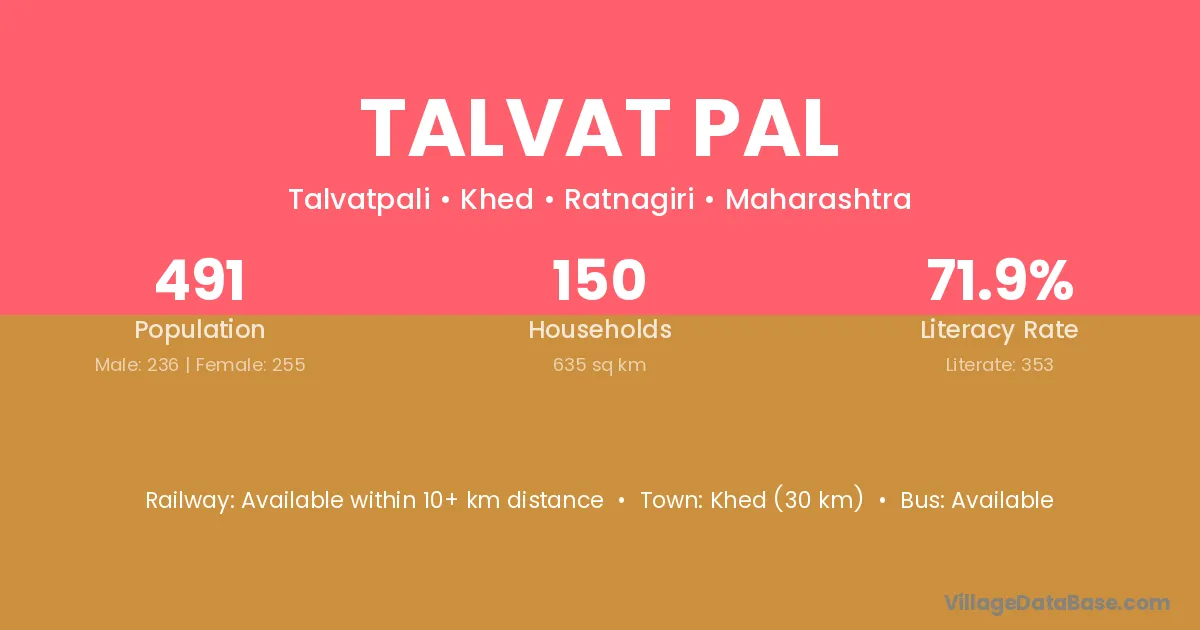 Khed (30 km) is the nearest town to Talvat Pal village for major economic activities and is located approximately 30 km away.