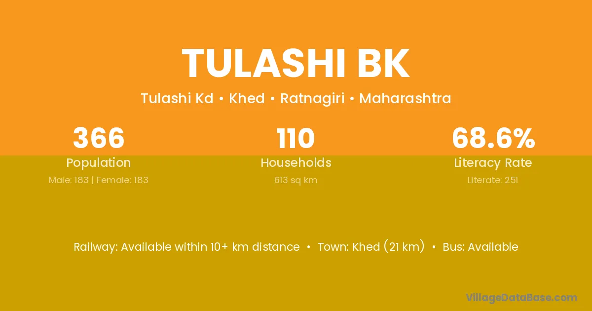 Khed (21 km) is the nearest town to Tulashi Bk village for major economic activities and is located approximately 21 km away.