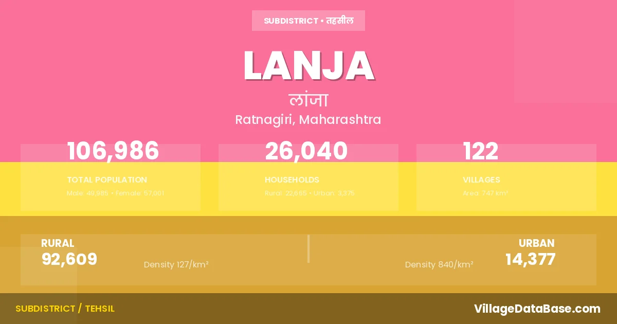 According to the 2011 census The total area of Lanja Tehsil is 747 km², with a population of 106986 people. The population density is 143 inhabitants per square kilometre, and there are approximately 26040 houses in the sub district.
