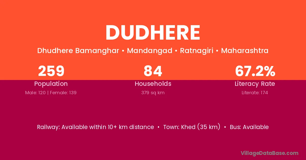 Dudhere village has a total population of 259 people, of which 120 are males and 139 are females.