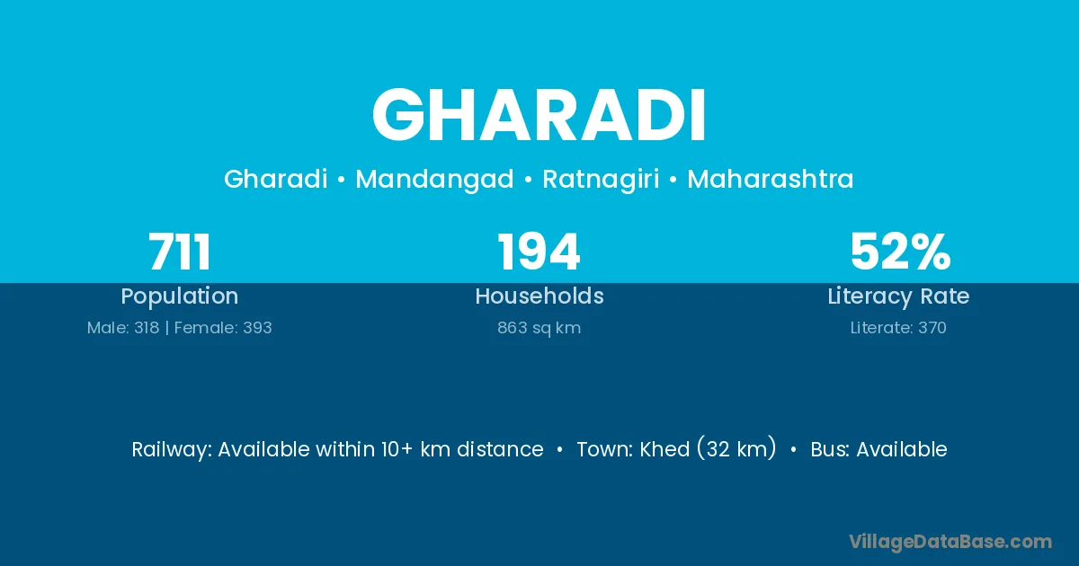 Khed (32 km) is the nearest town to Gharadi village for major economic activities and is located approximately 32 km away.